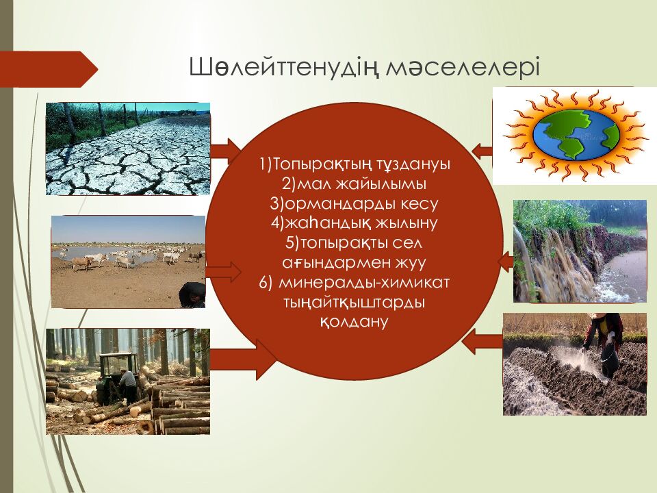 Шөлейттенудің мәселелері 1)Топырақтың тұздануы 2)мал жайылымы 3)ормандарды кесу 4)жаһандық жылыну 5)топырақты сел ағындармен жуу 6) минералды-химикат тыңайтқыштарды қолдану