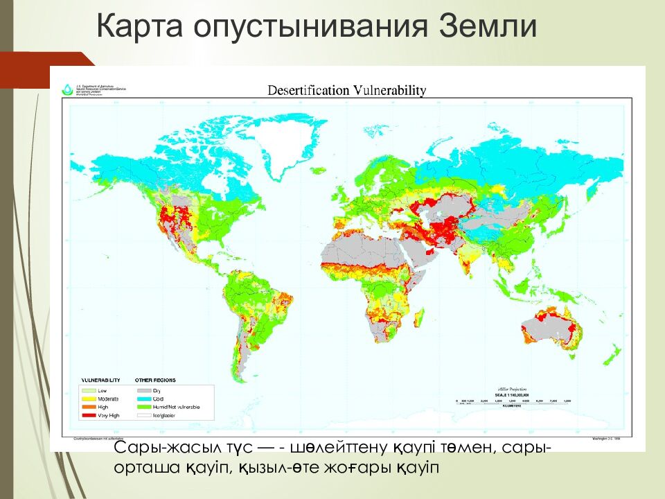 Сары-жасыл түс — - шөлейттену қаупі төмен, сары-орташа қауіп, қызыл-өте жоғары қауіп