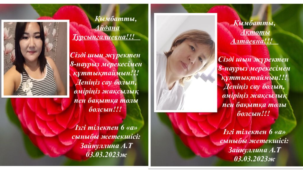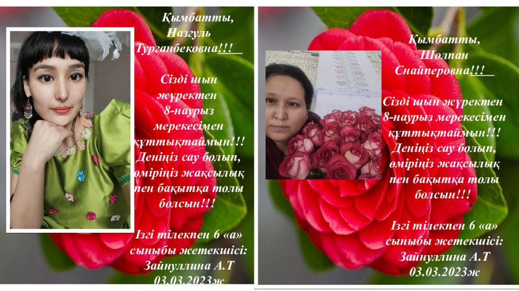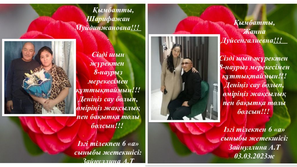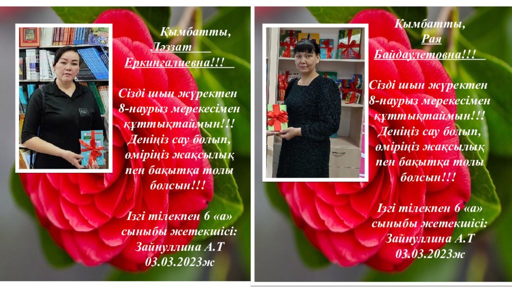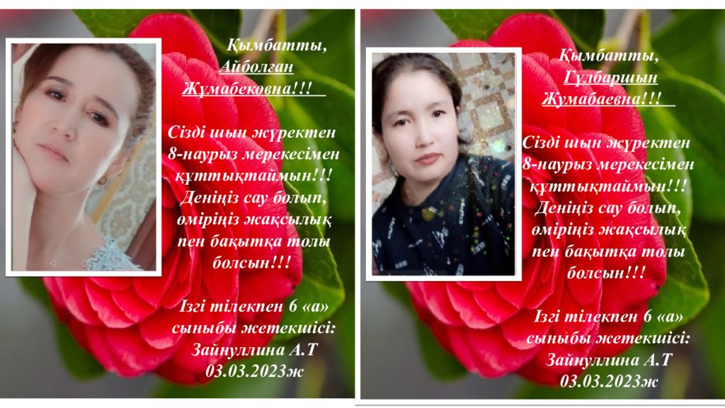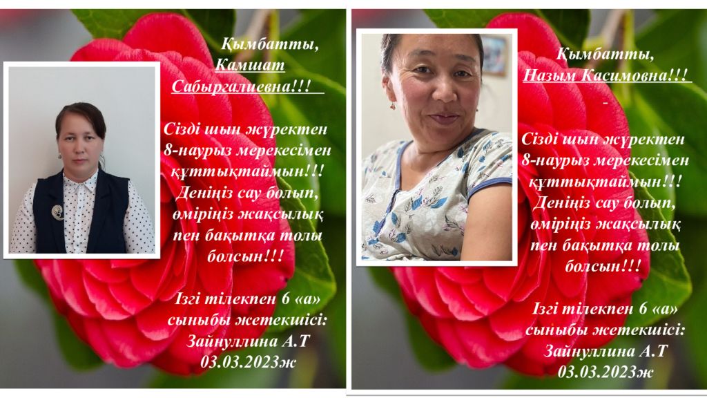 Қымбатты, Камшат Сабыргалиевна!!! Сізді шын жүректен 8 - нау рыз мерекесімен құттықтаймын!!! Деніңіз сау болып, өміріңіз жақсылық пен бақытқа толы болсын!!! Ізгі тілекпен 6 «а» сыныбы жетекшісі: Зайнуллина А.Т 03. 03.202 3 ж Қымбатты, Назым Касимовна!!! Сізді шын жүректен 8 - нау рыз мерекесімен құттықтаймын!!! Деніңіз сау болып, өміріңіз жақсылық пен бақытқа толы болсын!!! Ізгі тілекпен 6 «а» сыныбы жетекшісі: Зайнуллина А.Т 03. 03.202 3 ж