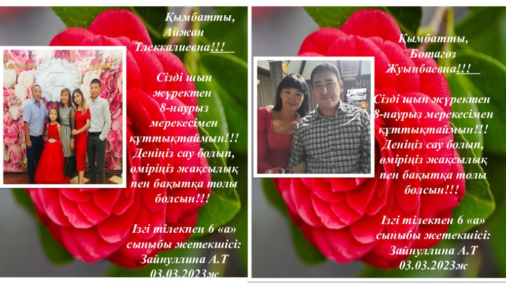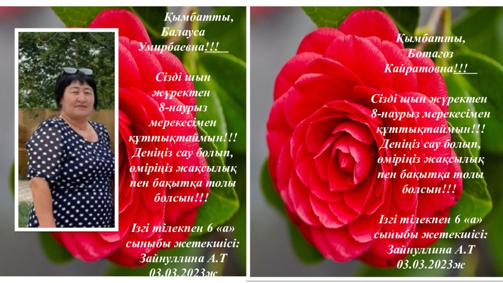 Қымбатты, Балауса Умирбаевна !!! Сізді шын жүректен 8 - нау рыз мерекесімен құттықтаймын!!! Деніңіз сау болып, өміріңіз жақсылық пен бақытқа толы болсын!!! Ізгі тілекпен 6 «а» сыныбы жетекшісі: Зайнуллина А.Т 03. 03.202 3 ж Қымбатты, Ботагоз Кайратовна !!! Сізді шын жүректен 8 - нау рыз мерекесімен құттықтаймын!!! Деніңіз сау болып, өміріңіз жақсылық пен бақытқа толы болсын!!! Ізгі тілекпен 6 «а» сыныбы жетекшісі: Зайнуллина А.Т 03. 03.202 3 ж