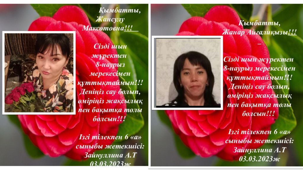 Қымбатты, Жансулу Максотовна !!! Сізді шын жүректен 8 - нау рыз мерекесімен құттықтаймын!!! Деніңіз сау болып, өміріңіз жақсылық пен бақытқа толы болсын!!! Ізгі тілекпен 6 «а» сыныбы жетекшісі: Зайнуллина А.Т 03. 03.202 3 ж Қымбатты, Жанар Айғалиқызы !!! Сізді шын жүректен 8 - нау рыз мерекесімен құттықтаймын!!! Деніңіз сау болып, өміріңіз жақсылық пен бақытқа толы болсын!!! Ізгі тілекпен 6 «а» сыныбы жетекшісі: Зайнуллина А.Т 03. 03.202 3 ж