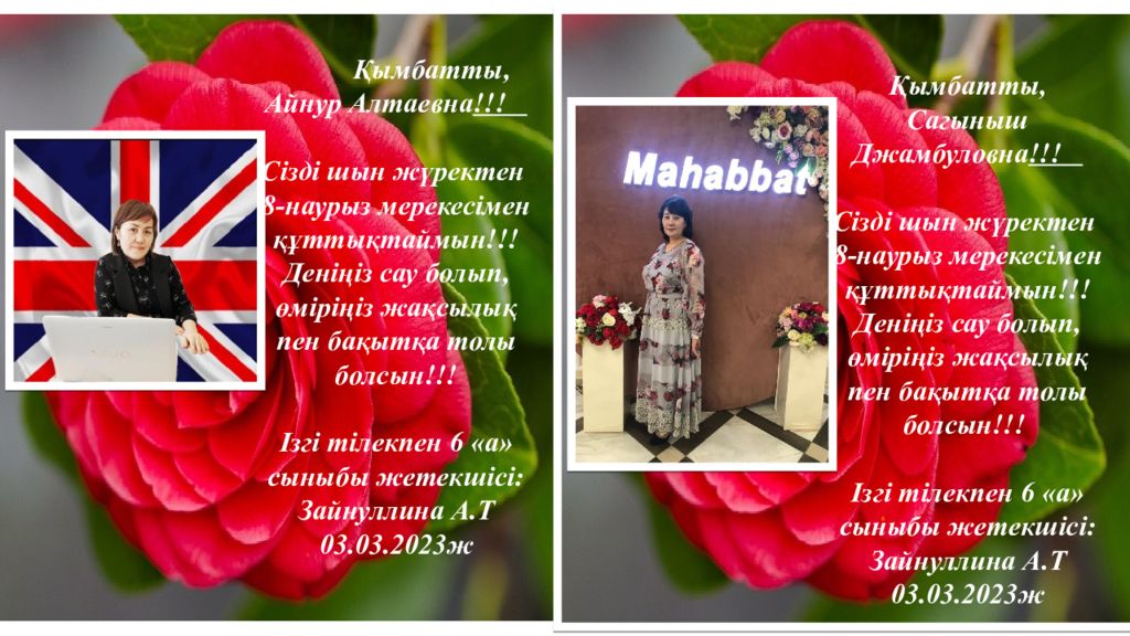 Қымбатты, Айнур Алтаевна !!! Сізді шын жүректен 8 - нау рыз мерекесімен құттықтаймын!!! Деніңіз сау болып, өміріңіз жақсылық пен бақытқа толы болсын!!! Ізгі тілекпен 6 «а» сыныбы жетекшісі: Зайнуллина А.Т 03. 03.202 3 ж Қымбатты, Сагыныш Джамбуловна !!! Сізді шын жүректен 8 - нау рыз мерекесімен құттықтаймын!!! Деніңіз сау болып, өміріңіз жақсылық пен бақытқа толы болсын!!! Ізгі тілекпен 6 «а» сыныбы жетекшісі: Зайнуллина А.Т 03. 03.202 3 ж