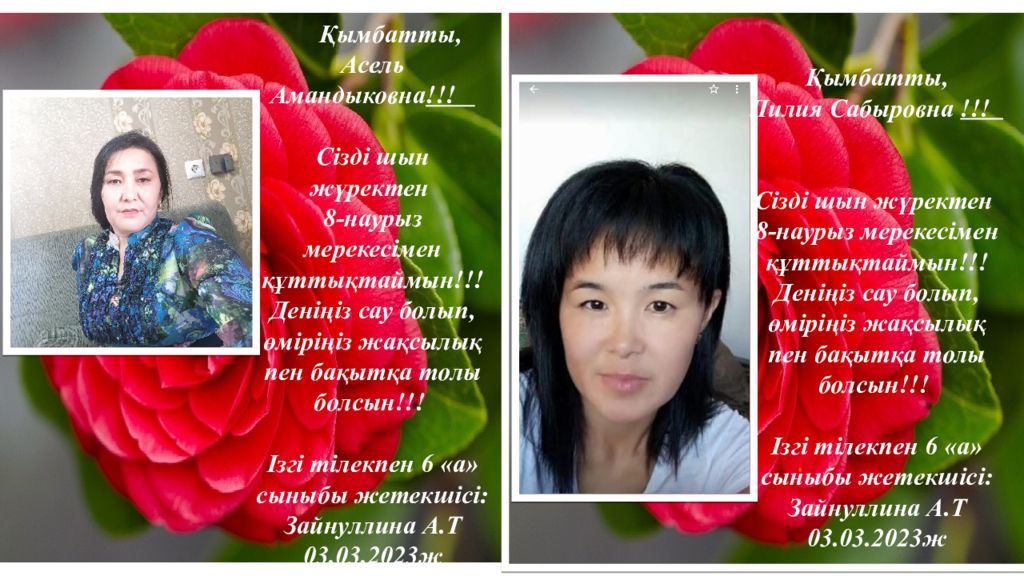 Қымбатты, Асель Амандыковна !!! Сізді шын жүректен 8 - нау рыз мерекесімен құттықтаймын!!! Деніңіз сау болып, өміріңіз жақсылық пен бақытқа толы болсын!!! Ізгі тілекпен 6 «а» сыныбы жетекшісі: Зайнуллина А.Т 03. 03.202 3 ж Қымбатты, Лилия Сабыровна !!! Сізді шын жүректен 8 - нау рыз мерекесімен құттықтаймын!!! Деніңіз сау болып, өміріңіз жақсылық пен бақытқа толы болсын!!! Ізгі тілекпен 6 «а» сыныбы жетекшісі: Зайнуллина А.Т 03. 03.202 3 ж