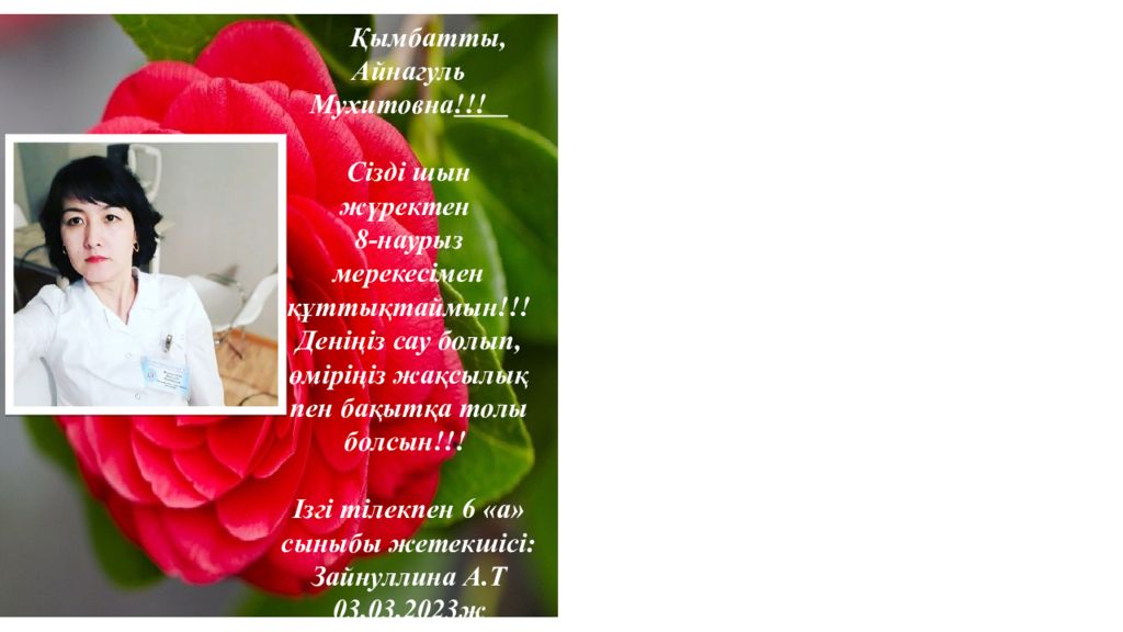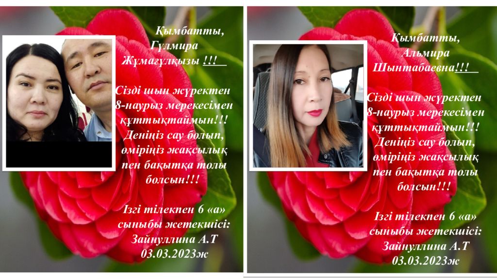 Қымбатты, Гүлмира Жұмағұлқызы !!! Сізді шын жүректен 8 - нау рыз мерекесімен құттықтаймын!!! Деніңіз сау болып, өміріңіз жақсылық пен бақытқа толы болсын!!! Ізгі тілекпен 6 «а» сыныбы жетекшісі: Зайнуллина А.Т 03. 03.202 3 ж Қымбатты, Альмира Шынтабаевна !!! Сізді шын жүректен 8 - нау рыз мерекесімен құттықтаймын!!! Деніңіз сау болып, өміріңіз жақсылық пен бақытқа толы болсын!!! Ізгі тілекпен 6 «а» сыныбы жетекшісі: Зайнуллина А.Т 03. 03.202 3 ж