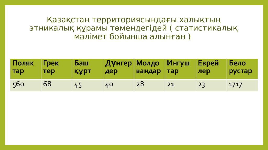 Поляк тар Грек тер Баш құрт Дүнгердер Молдовандар Ингуш тар Еврей лер Бело рустар 560 68 45 40 28 21 23 1717