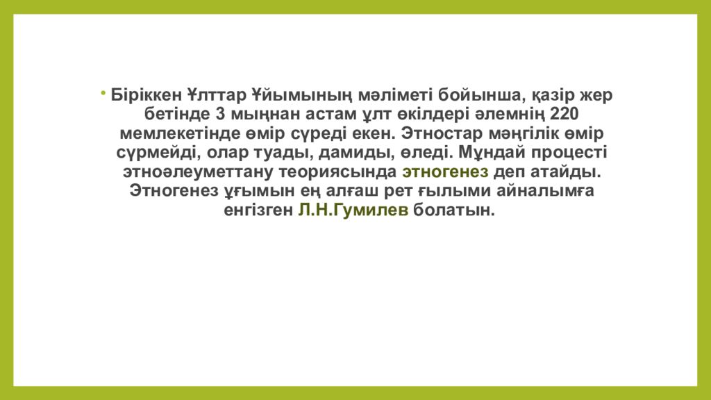 Біріккен Ұлттар Ұйымының мәліметі бойынша, қазір жер бетінде 3 мыңнан астам ұлт өкілдері әлемнің 220 мемлекетінде өмір сүреді екен. Этностар мәңгілік өмір сүрмейді, олар туады, дамиды, өледі. Мұндай процесті этноәлеуметтану теориясында этногенез деп атайды. Этногенез ұғымын ең алғаш рет ғылыми айналымға енгізген Л.Н.Гумилев болатын.