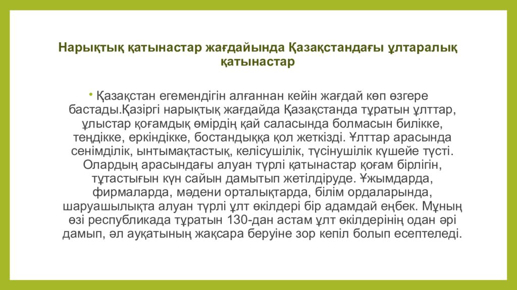 Қазақстан егемендігін алғаннан кейін жағдай көп өзгере бастады.Қазіргі нарықтық жағдайда Қазақстанда тұратын ұлттар, ұлыстар қоғамдық өмірдің қай саласында болмасын билікке, теңдікке, еркіндікке, бостандыққа қол жеткізді. Ұлттар арасында сенімділік, ынтымақтастық, келісушілік, түсінушілік күшейе түсті. Олардың арасындағы алуан түрлі қатынастар қоғам бірлігін, тұтастығын күн сайын дамытып жетілдіруде. Ұжымдарда, фирмаларда, мәдени орталықтарда, білім ордаларында, шаруашылықта алуан түрлі ұлт өкілдері бір адамдай еңбек. Мұның өзі республикада тұратын 130-дан астам ұлт өкілдерінің одан әрі дамып, әл ауқатының жақсара беруіне зор кепіл болып есептеледі.