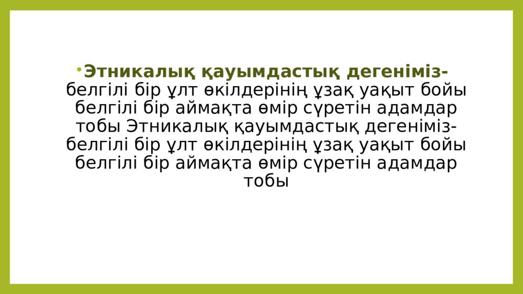 Этникалық қауымдастық дегеніміз- белгілі бір ұлт өкілдерінің ұзақ уақыт бойы белгілі бір аймақта өмір сүретін адамдар тобы Этникалық қауымдастық дегеніміз-белгілі бір ұлт өкілдерінің ұзақ уақыт бойы белгілі бір аймақта өмір сүретін адамдар тобы