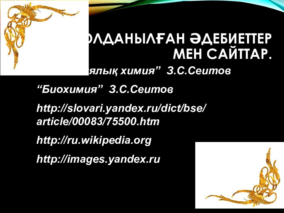 “Биологиялық химия” З.С.Сеитов “Биохимия” З.С.Сеитов http://slovari.yandex.ru/dict/bse/article/00083/75500.htm http://ru.wikipedia.org http://images.yandex.ru
