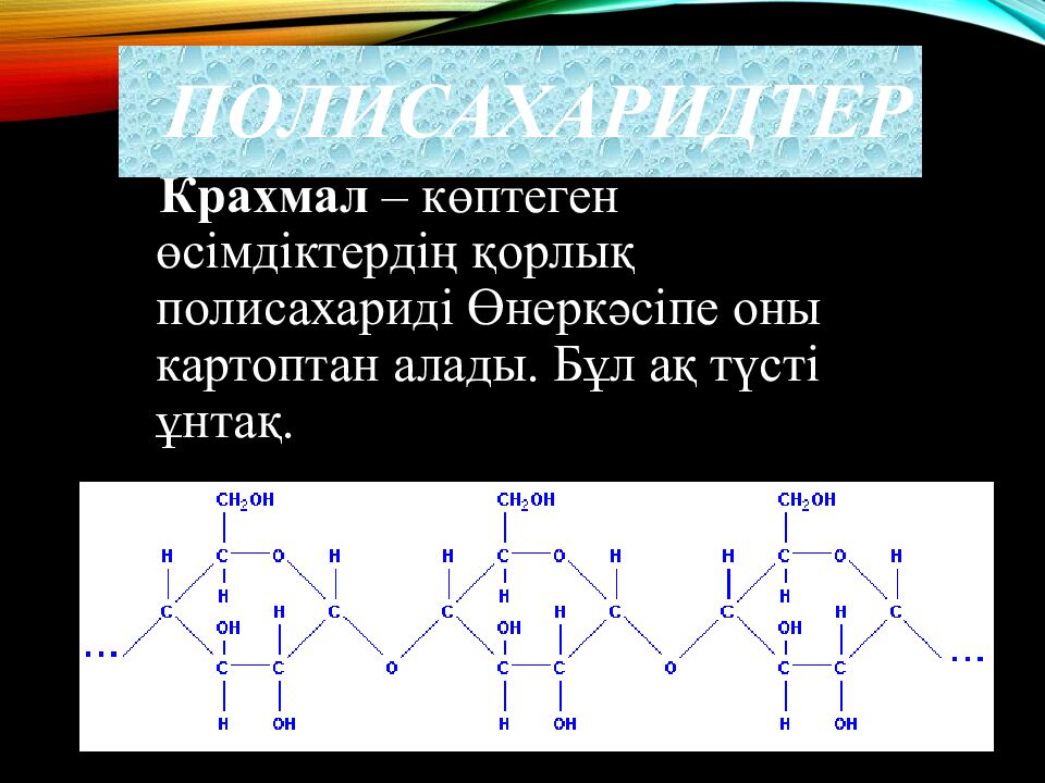 Крахмал – көптеген өсімдіктердің қорлық полисахариді Өнеркәсіпе оны картоптан алады. Бұл ақ түсті ұнтақ.