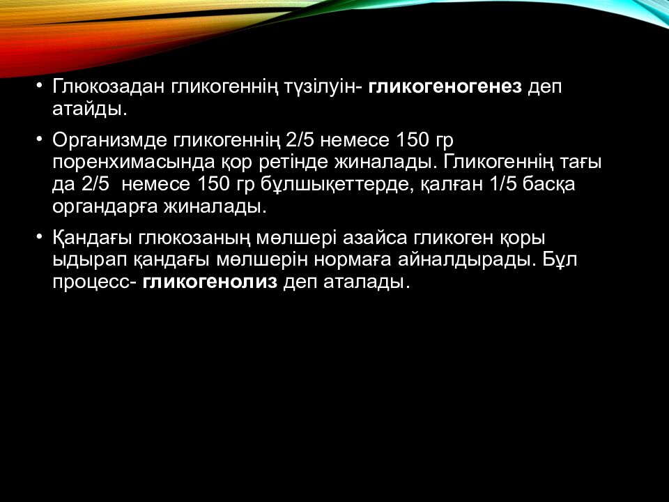 Глюкозадан гликогеннің түзілуін- гликогеногенез деп атайды. Организмде гликогеннің 2/5 немесе 150 гр поренхимасында қор ретінде жиналады. Гликогеннің тағы да 2/5 немесе 150 гр бұлшықеттерде, қалған 1/5 басқа органдарға жиналады. Қандағы глюкозаның мөлшері азайса гликоген қоры ыдырап қандағы мөлшерін нормаға айналдырады. Бұл процесс- гликогенолиз деп аталады.