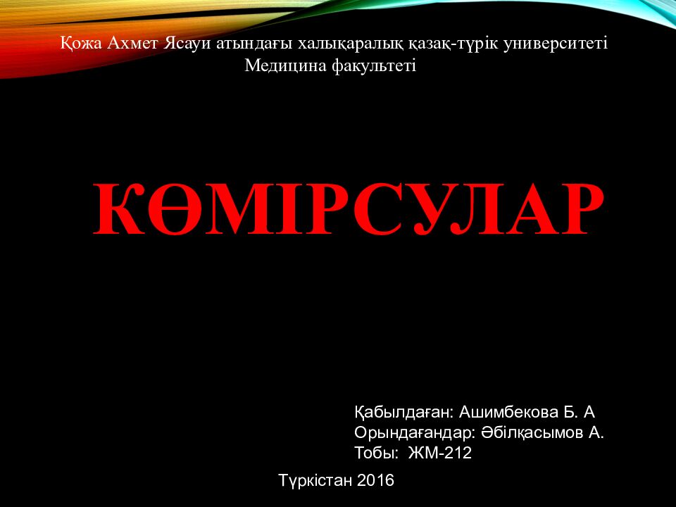 Қожа Ахмет Ясауи атындағы халықаралық қазақ-түрік университеті Медицина факультеті Қабылдаған: Ашимбекова Б. А Орындағандар: Әбілқасымов А. Тобы: ЖМ-212 КӨМІРСУЛАР Түркістан 2016