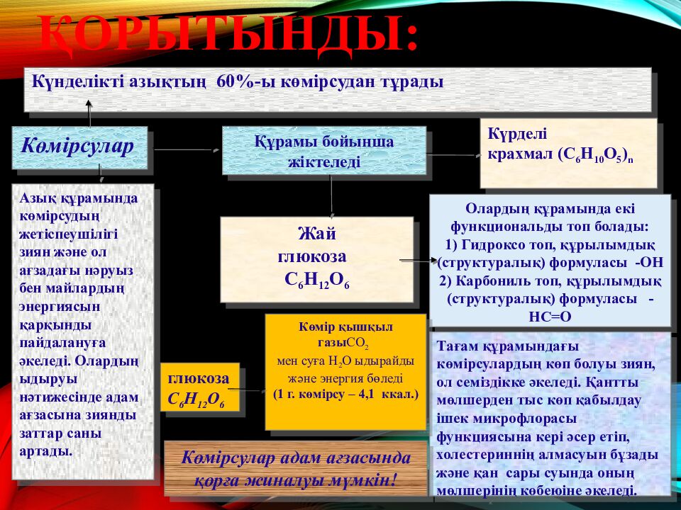 Күнделікті азықтың 60%-ы көмірсудан тұрады Көмірсулар Азық құрамында көмірсудың жетіспеушілігі зиян және ол ағзадағы нәруыз бен майлардың энергиясын қарқынды пайдалануға әкеледі. Олардың ыдыруы нәтижесінде адам ағзасына зиянды заттар саны артады. Құрамы бойынша жіктеледі Күрделі крахмал (С 6 Н 10 О 5 ) n Жай глюкоза С 6 Н 12 О 6 Олардың құрамында екі функциональды топ болады: 1) Гидроксо топ, құрылымдық (структуралық) формуласы -ОН 2) Карбониль топ, құрылымдық (структуралық) формуласы -НС=О Тағам құрамындағы көмірсулардың көп болуы зиян, ол семіздікке әкеледі. Қантты мөлшерден тыс көп қабылдау ішек микрофлорасы функциясына кері әсер етіп, холестериннің алмасуын бұзады және қан сары суында оның мөлшерінің көбеюіне әкеледі. Көмірсулар адам ағзасында қорға жиналуы мүмкін! глюкоза С 6 H 12 O 6 Көмір қышқыл газы СО 2 мен суға Н 2 О ыдырайды және энергия бөледі (1 г. көмірсу – 4,1 ккал.)