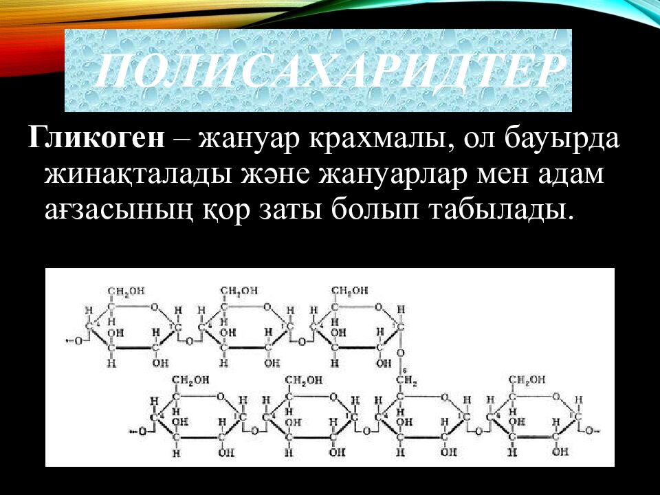 Гликоген – жануар крахмалы, ол бауырда жинақталады және жануарлар мен адам ағзасының қор заты болып табылады.