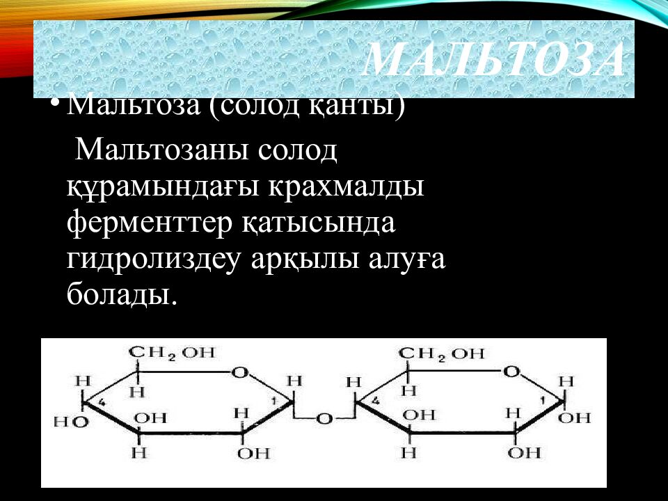 Мальтоза (солод қанты) Мальтозаны солод құрамындағы крахмалды ферменттер қатысында гидролиздеу арқылы алуға болады.