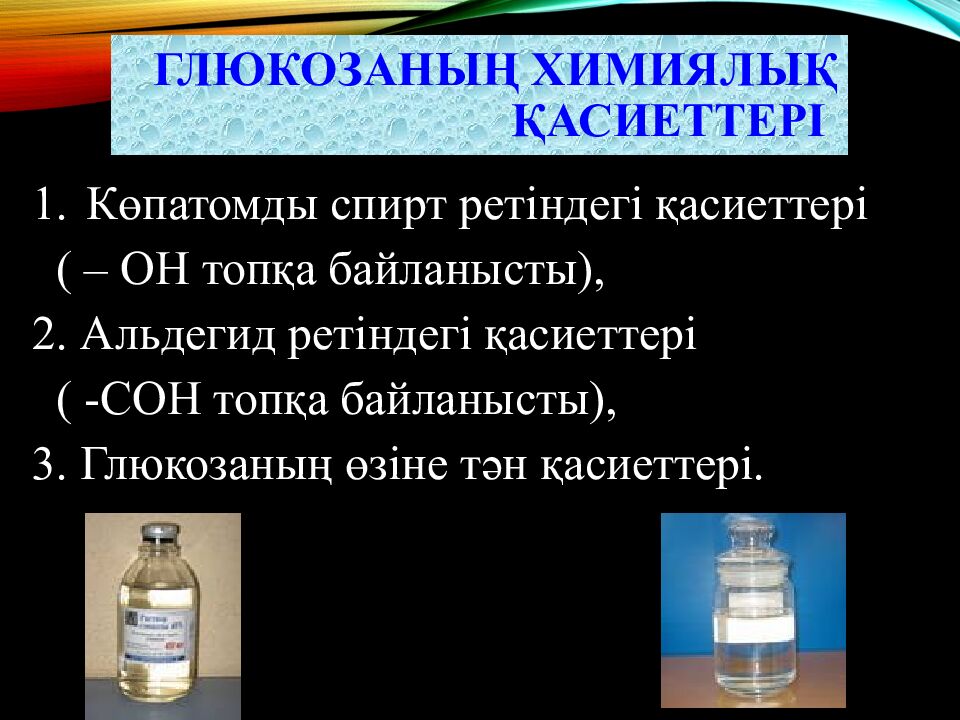 Көпатомды спирт ретіндегі қасиеттері ( – ОН топқа байланысты), 2. Альдегид ретіндегі қасиеттері ( -СОН топқа байланысты), 3. Глюкозаның өзіне тән қасиеттері.
