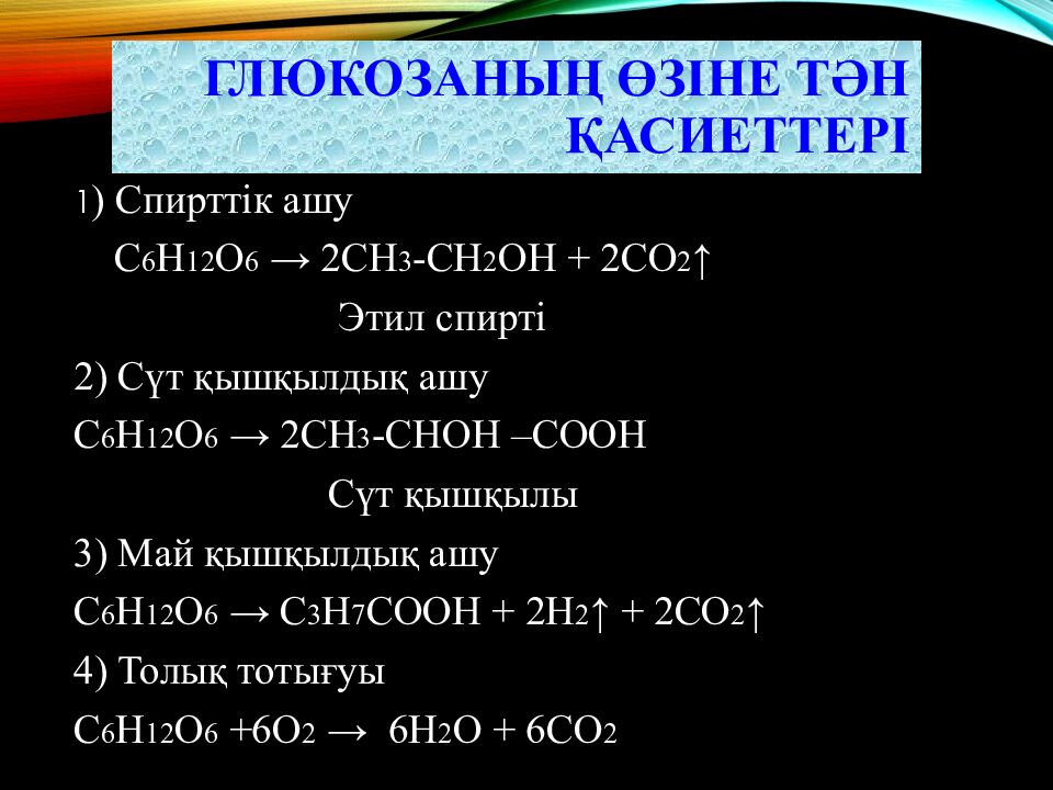 1 ) Спирттік ашу С 6 Н 12 О 6 → 2СН 3 -СН 2 ОН + 2СО 2 ↑ Этил спирті 2) Сүт қышқылдық ашу С 6 Н 12 О 6 → 2СН 3 -СНОН –СООН Сүт қышқылы 3) Май қышқылдық ашу С 6 Н 12 О 6 → С 3 Н 7 СООН + 2Н 2 ↑ + 2СО 2 ↑ 4) Толық тотығуы С 6 Н 12 О 6 +6О 2 → 6Н 2 О + 6СО 2