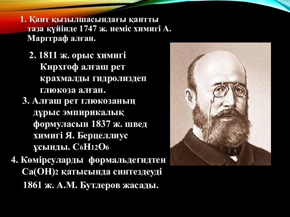1. Қант қызылшасындағы қантты таза күйінде 1747 ж. неміс химигі А. Маргграф алған. 2. 1811 ж. орыс химигі Кирхгоф алғаш рет крахмалды гидролиздеп глюкоза алған. 3. Алғаш рет глюкозаның дұрыс эмпирикалық формуласын 1837 ж. швед химигі Я. Берцеллиус ұсынды. С 6 Н 12 О 6 4. Көмірсуларды формальдегидтен Са(ОН) 2 қатысында синтездеуді 1861 ж. А.М. Бутлеров жасады.