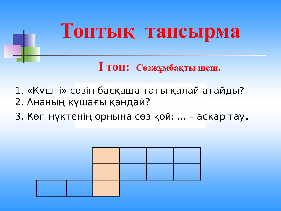 І топ: Сөзжұмбақты шеш. 1. « Күшті » сөзін басқаша тағы қалай атайды ? 2. Ананың құшағы қандай ? 3. Көп нүктенің орнына сөз қой :... – асқар тау. Топтық тапсырма
