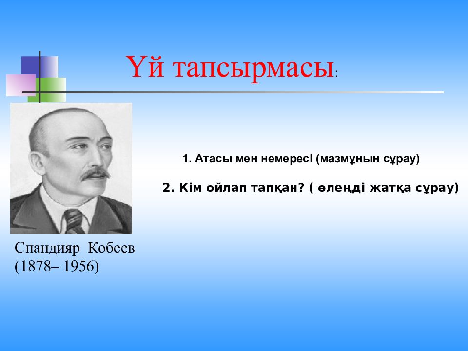 Үй тапсырмасы : Спандияр Көбеев (1878– 1956) 1. Атасы мен немересі ( мазмұнын сұрау ) 2. Кім ойлап тапқан ? ( өлеңді жатқа сұрау )