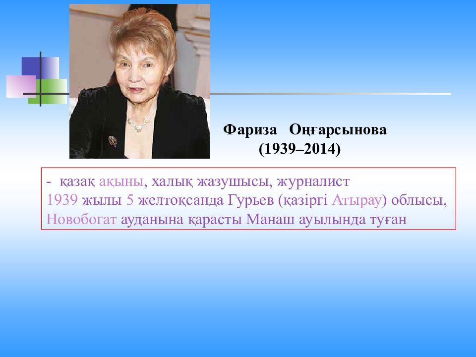 Фариза Оңғарсынова ( 1939–2014) - қазақ ақыны, халық жазушысы, журналист 1939 жылы 5 желтоқсанда Гурьев ( қазіргі Атырау ) облысы, Новобогат ауданына қарасты Манаш ауылында туған