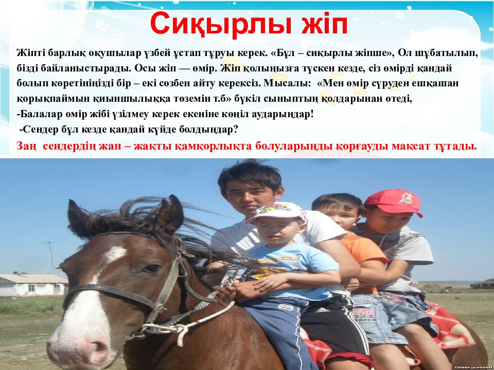 Жіпті барлық оқушылар үзбей ұстап тұруы керек. «Бұл – сиқырлы жіпше », Ол шұбатылып, бізді байланыстырады. Осы жіп — өмір. Жіп қолыңызға түскен кезде, сіз өмірді қандай болып көретініңізді бір – екі сөзбен айту керексіз. Мысалы: «Мен өмір сүруден ешқашан қорықпаймын қиыншылыққа төземін т.б» бүкіл сыныптың қолдарынан өтеді, -Балалар өмір жібі үзілмеу керек екеніне көңіл аударыңдар! -Сендер бұл кезде қандай күйде болдыңдар? Заң сендердің жан – жақты қамқорлықта болуларыңды қорғауды мақсат тұтады.