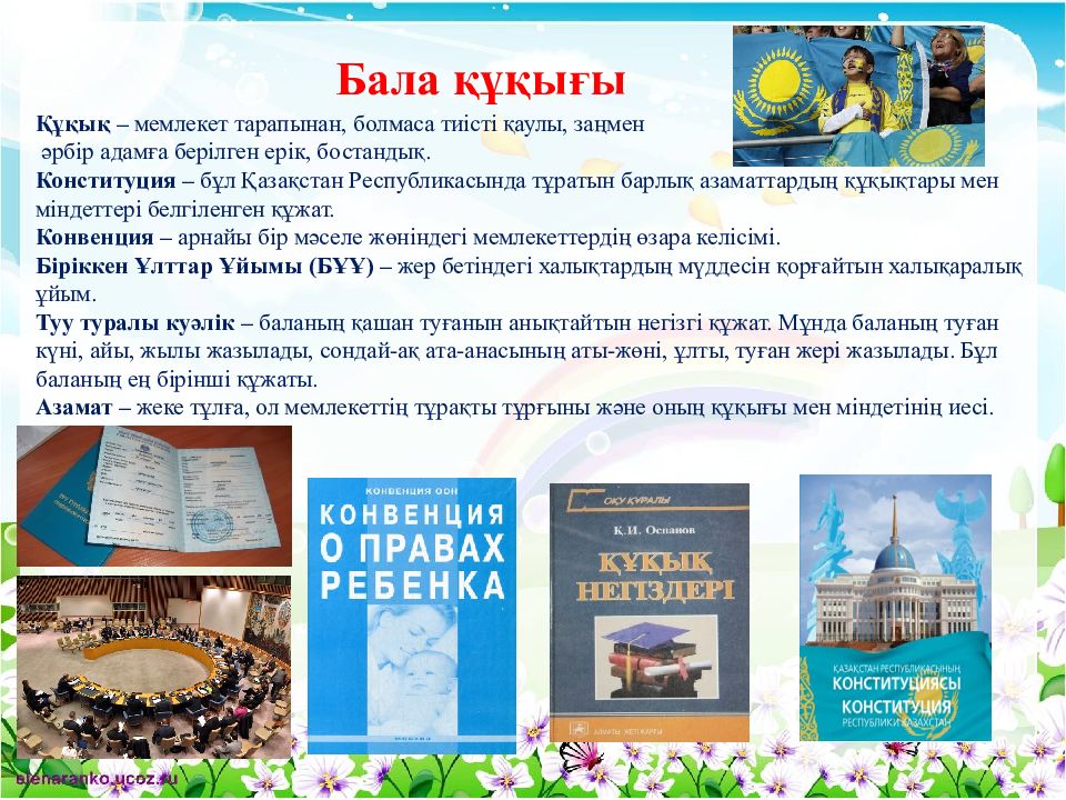 Құқық – мемлекет тарапынан, болмаса тиісті қаулы, заңмен әрбір адамға берілген ерік, бостандық. Конституция – бұл Қазақстан Республикасында тұратын барлық азаматтардың құқықтары мен міндеттері белгіленген құжат. Конвенция – арнайы бір мәселе жөніндегі мемлекеттердің өзара келісімі. Біріккен Ұлттар Ұйымы (БҰҰ) – жер бетіндегі халықтардың мүддесін қорғайтын халықаралық ұйым. Туу туралы куәлік – баланың қашан туғанын анықтайтын негізгі құжат. Мұнда баланың туған күні, айы, жылы жазылады, сондай-ақ ата-анасының аты-жөні, ұлты, туған жері жазылады. Бұл баланың ең бірінші құжаты. Азамат – жеке тұлға, ол мемлекеттің тұрақты тұрғыны және оның құқығы мен міндетінің иесі. Бала құқығы