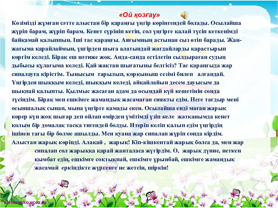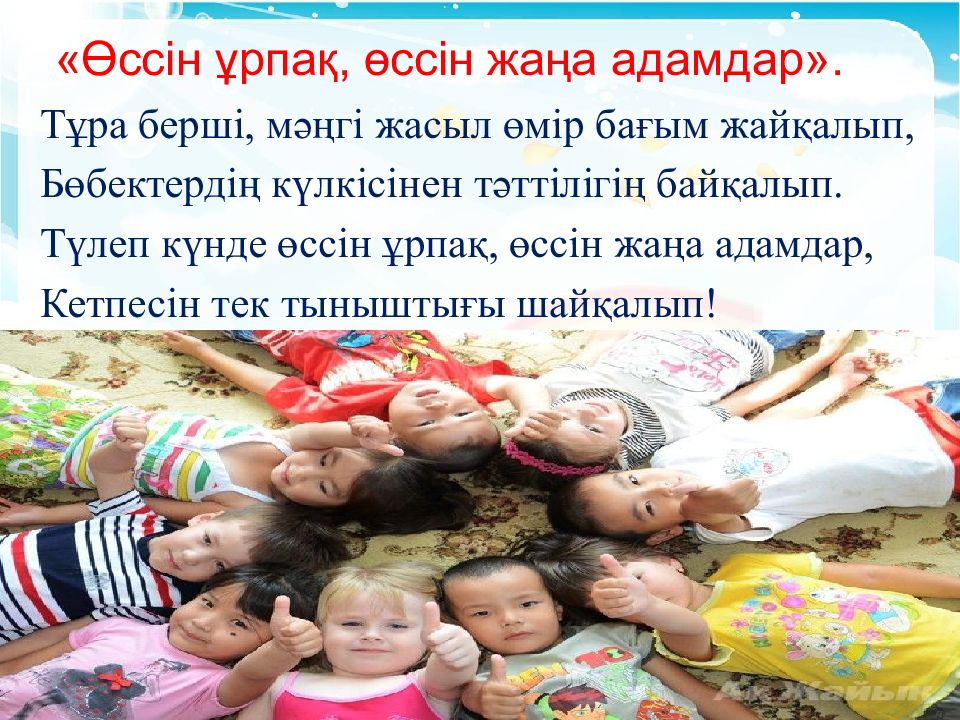 Тұра берші, мәңгі жасыл өмір бағым жайқалып, Бөбектердің күлкісінен тәттілігің байқалып. Түлеп күнде өссін ұрпақ, өссін жаңа адамдар, Кетпесін тек тыныштығы шайқалып!