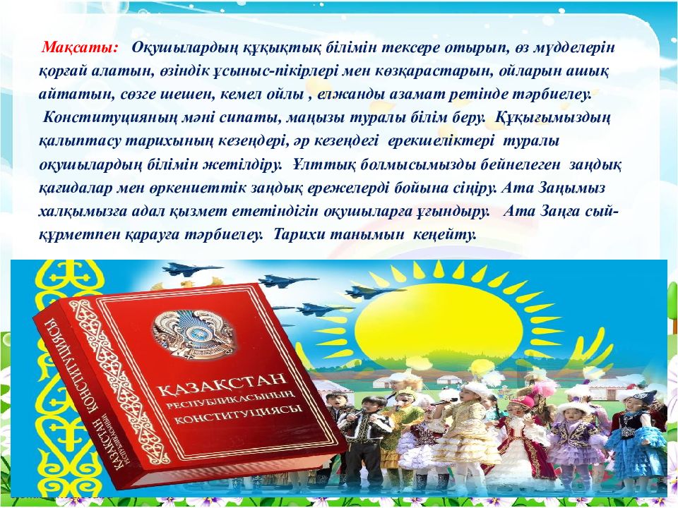 Мақсаты: Оқушылардың құқықтық білімін тексере отырып, өз мүдделерін қорғай алатын, өзіндік ұсыныс-пікірлері мен көзқарастарын, ойларын ашық айтатын, сөзге шешен, кемел ойлы, елжанды азамат ретінде тәрбиелеу. Конституцияның мәні сипаты, маңызы туралы білім беру. Құқығымыздың қалыптасу тарихының кезеңдері, әр кезеңдегі ерекшеліктері туралы оқушылардың білімін жетілдіру. Ұлттық болмысымызды бейнелеген заңдық қағидалар мен өркениеттік заңдық ережелерді бойына сіңіру. Ата Заңымыз халқымызға адал қызмет ететіндігін оқушыларға ұғындыру. Ата Заңға сый- құрметпен қарауға тәрбиелеу. Тарихи танымын кеңейту.