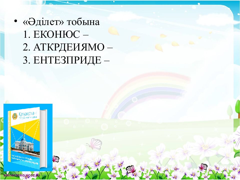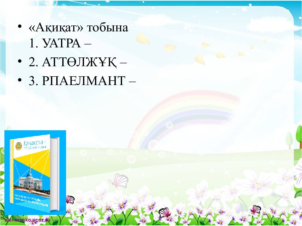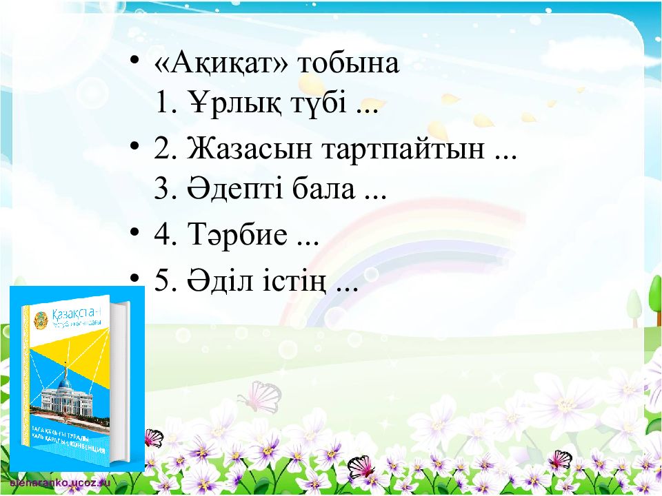 «Ақиқат» тобына 1. Ұрлық түбі... 2. Жазасын тартпайтын... 3. Әдепті бала... 4. Тәрбие... 5. Әділ істің...