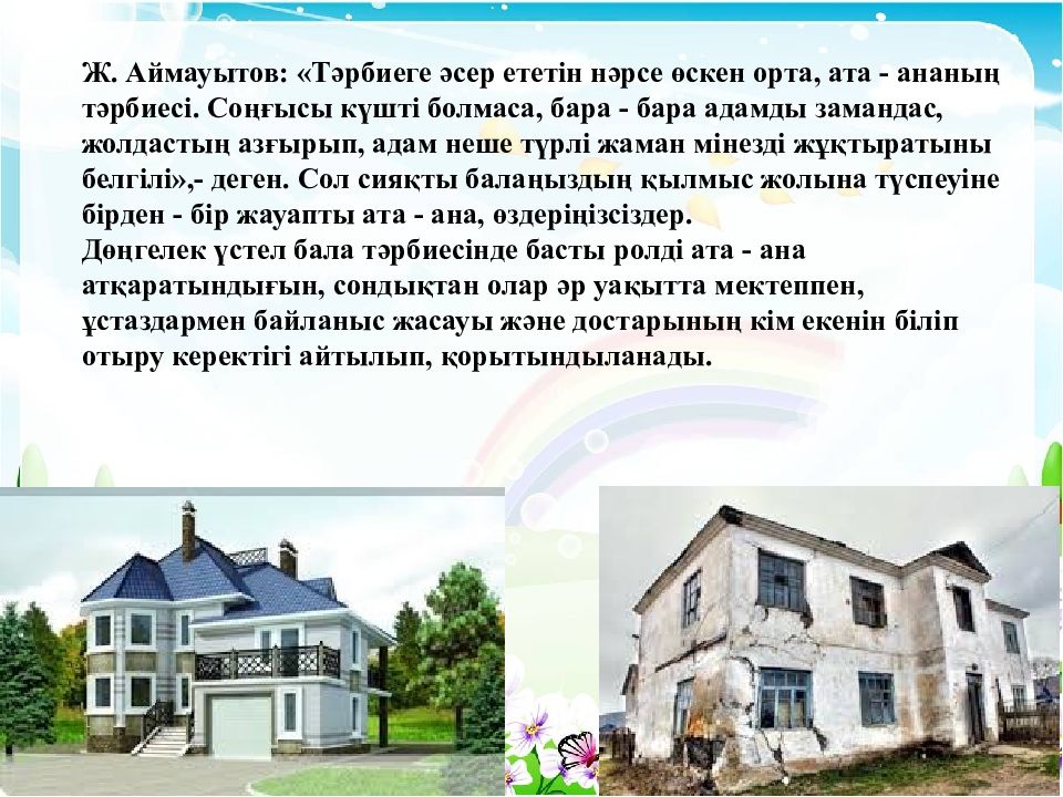 Ж. Аймауытов: «Тәрбиеге әсер ететін нәрсе өскен орта, ата - ананың тәрбиесі. Соңғысы күшті болмаса, бара - бара адамды замандас, жолдастың азғырып, адам неше түрлі жаман мінезді жұқтыратыны белгілі»,- деген. Сол сияқты балаңыздың қылмыс жолына түспеуіне бірден - бір жауапты ата - ана, өздеріңізсіздер. Дөңгелек үстел бала тәрбиесінде басты ролді ата - ана атқаратындығын, сондықтан олар әр уақытта мектеппен, ұстаздармен байланыс жасауы және достарының кім екенін біліп отыру керектігі айтылып, қорытындыланады.