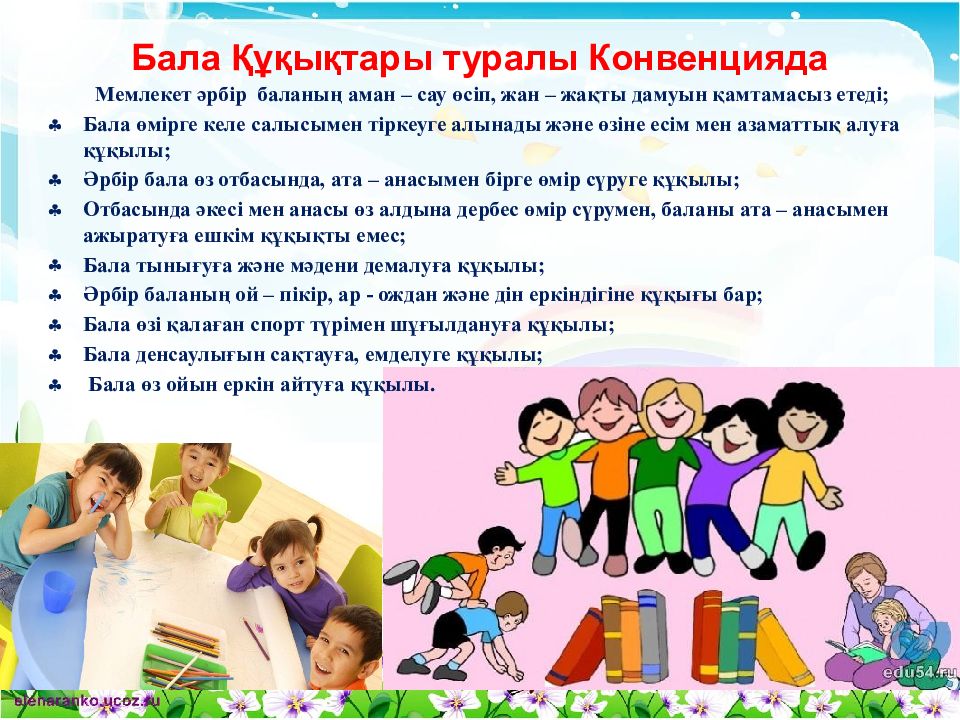 Мемлекет әрбір баланың аман – сау өсіп, жан – жақты дамуын қамтамасыз етеді; Бала өмірге келе салысымен тіркеуге алынады және өзіне есім мен азаматтық алуға құқылы; Әрбір бала өз отбасында, ата – анасымен бірге өмір сүруге құқылы; Отбасында әкесі мен анасы өз алдына дербес өмір сүрумен, баланы ата – анасымен ажыратуға ешкім құқықты емес; Бала тынығуға және мәдени демалуға құқылы; Әрбір баланың ой – пікір, ар - ождан және дін еркіндігіне құқығы бар; Бала өзі қалаған спорт түрімен шұғылдануға құқылы; Бала денсаулығын сақтауға, емделуге құқылы; Бала өз ойын еркін айтуға құқылы.