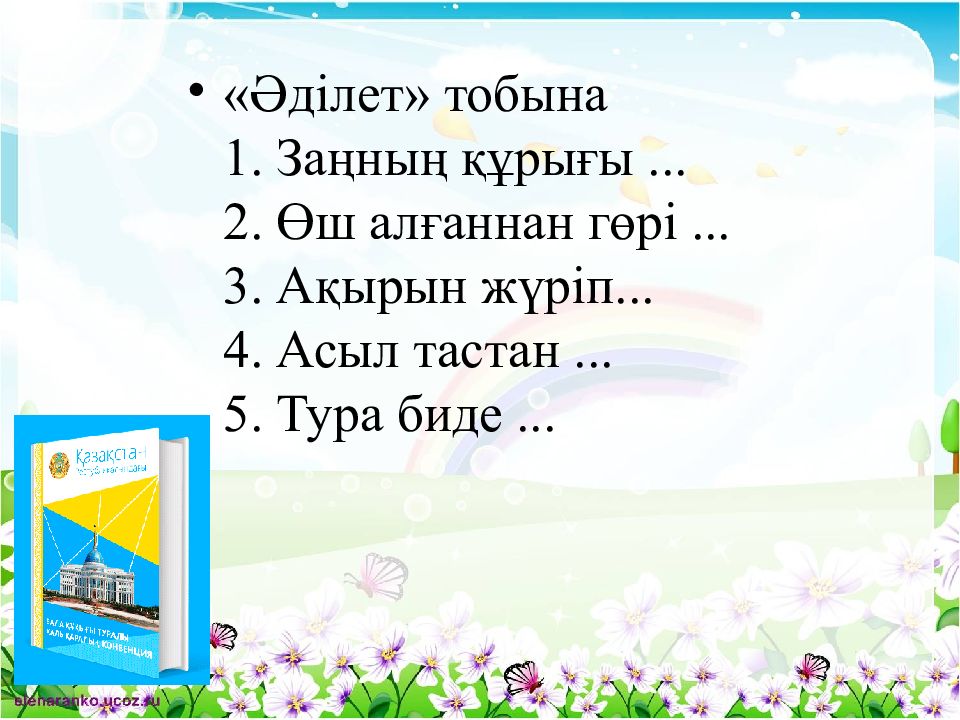 «Әділет» тобына 1. Заңның құрығы... 2. Өш алғаннан гөрі... 3. Ақырын жүріп... 4. Асыл тастан... 5. Тура биде...