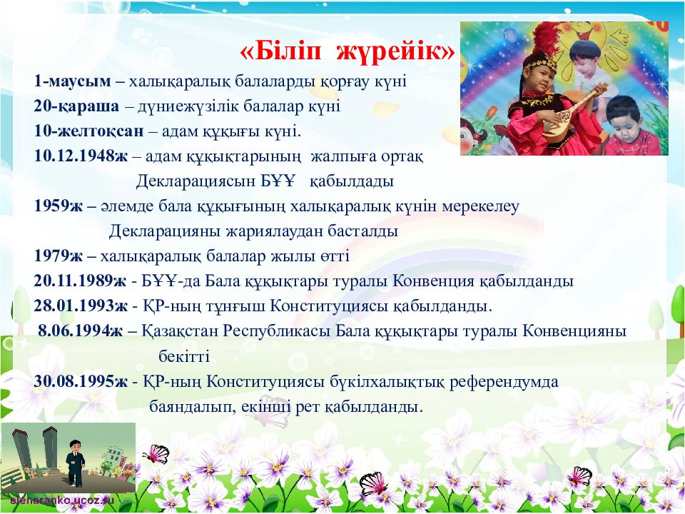 «Біліп жүрейік» 1-маусым – халықаралық балаларды қорғау күні 20-қараша – дүниежүзілік балалар күні 10-желтоқсан – адам құқығы күні. 10.12.1948ж – адам құқықтарының жалпыға ортақ Декларациясын БҰҰ қабылдады 1959ж – әлемде бала құқығының халықаралық күнін мерекелеу Декларацияны жариялаудан басталды 1979ж – халықаралық балалар жылы өтті 20.11.1989ж - БҰҰ-да Бала құқықтары туралы Конвенция қабылданды 28.01.1993ж - ҚР-ның тұнғыш Конституциясы қабылданды. 8.06.1994ж – Қазақстан Республикасы Бала құқықтары туралы Конвенцияны бекітті 30.08.1995ж - ҚР-ның Конституциясы бүкілхалықтық референдумда баяндалып, екінші рет қабылданды.