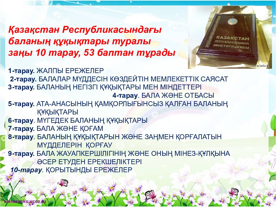 Слайд 5: Қазақстан Республикасындағы баланың құқықтары туралы заңы 10 тарау, 53 баптан тұрады 1-тарау. ЖАЛПЫ ЕРЕЖЕЛЕР 2-тарау. БАЛАЛАР МҮДДЕСIН КӨЗДЕЙТIН МЕМЛЕКЕТТIК САЯСАТ 3-тарау. БАЛАНЫҢ НЕГIЗГI ҚҰҚЫҚТАРЫ МЕН МIНДЕТТЕРI 4-тарау. БАЛА ЖӘНЕ ОТБАСЫ 5-тарау. АТА-АНАСЫНЫҢ ҚАМҚОРЛЫҒЫНСЫЗ ҚАЛҒАН БАЛАНЫҢ ҚҰҚЫҚТАРЫ 6-тарау. МҮГЕДЕК БАЛАНЫҢ ҚҰҚЫҚТАРЫ 7-тарау. БАЛА ЖӘНЕ ҚОҒАМ 8-тарау. БАЛАНЫҢ ҚҰҚЫҚТАРЫН ЖӘНЕ ЗАҢМЕН ҚОРҒАЛАТЫН МYДДЕЛЕРIН ҚОРҒАУ 9-тарау. БАЛА ЖАУАПКЕРШIЛIГIНIҢ ЖӘНЕ ОНЫҢ МIНЕЗ-ҚҰЛҚЫНА ӘСЕР ЕТУДЕН ЕРЕКШЕЛIКТЕРI 10-тарау. ҚОРЫТЫНДЫ ЕРЕЖЕЛЕР