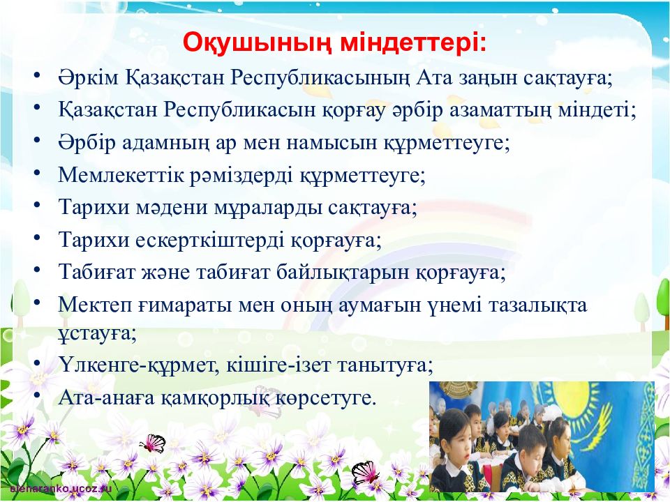 Әркім Қазақстан Республикасының Ата заңын сақтауға; Қазақстан Республикасын қорғау әрбір азаматтың міндеті; Әрбір адамның ар мен намысын құрметтеуге; Мемлекеттік рәміздерді құрметтеуге; Тарихи мәдени мұраларды сақтауға; Тарихи ескерткіштерді қорғауға; Табиғат және табиғат байлықтарын қорғауға; Мектеп ғимараты мен оның аумағын үнемі тазалықта ұстауға; Үлкенге-құрмет, кішіге-ізет танытуға; Ата-анаға қамқорлық көрсетуге.