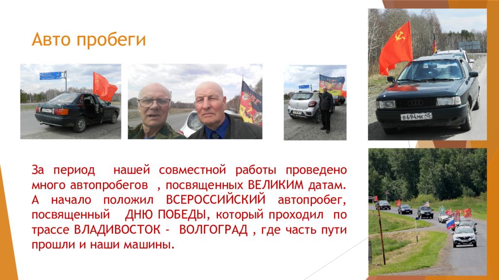 За период нашей совместной работы проведено много автопробегов, посвященных ВЕЛИКИМ датам. А начало положил ВСЕРОССИЙСКИЙ автопробег, посвященный ДНЮ ПОБЕДЫ, который проходил по трассе ВЛАДИВОСТОК - ВОЛГОГРАД, где часть пути прошли и наши машины.