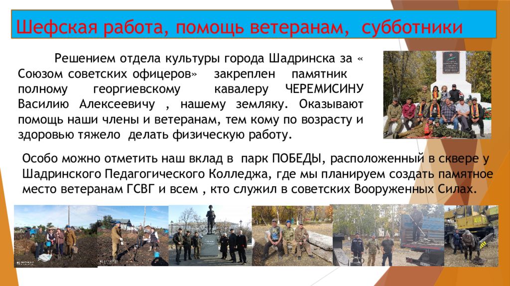 Решением отдела культуры города Шадринска за « Союзом советских офицеров» закреплен памятник полному георгиевскому кавалеру ЧЕРЕМИСИНУ Василию Алексеевичу, нашему земляку. Оказывают помощь наши члены и ветеранам, тем кому по возрасту и здоровью тяжело делать физическую работу. Особо можно отметить наш вклад в парк ПОБЕДЫ, расположенный в сквере у Шадринского Педагогического Колледжа, где мы планируем создать памятное м есто ветеранам ГСВГ и всем, кто служил в советских Вооруженных Силах.