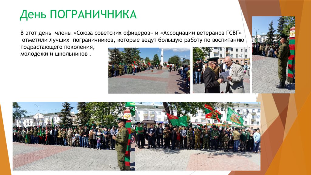 В этот день члены «Союза советских офицеров» и «Ассоциации ветеранов ГСВГ» отметили лучших пограничников, которые ведут большую работу по воспитанию подрастающего поколения, молодежи и школьников.