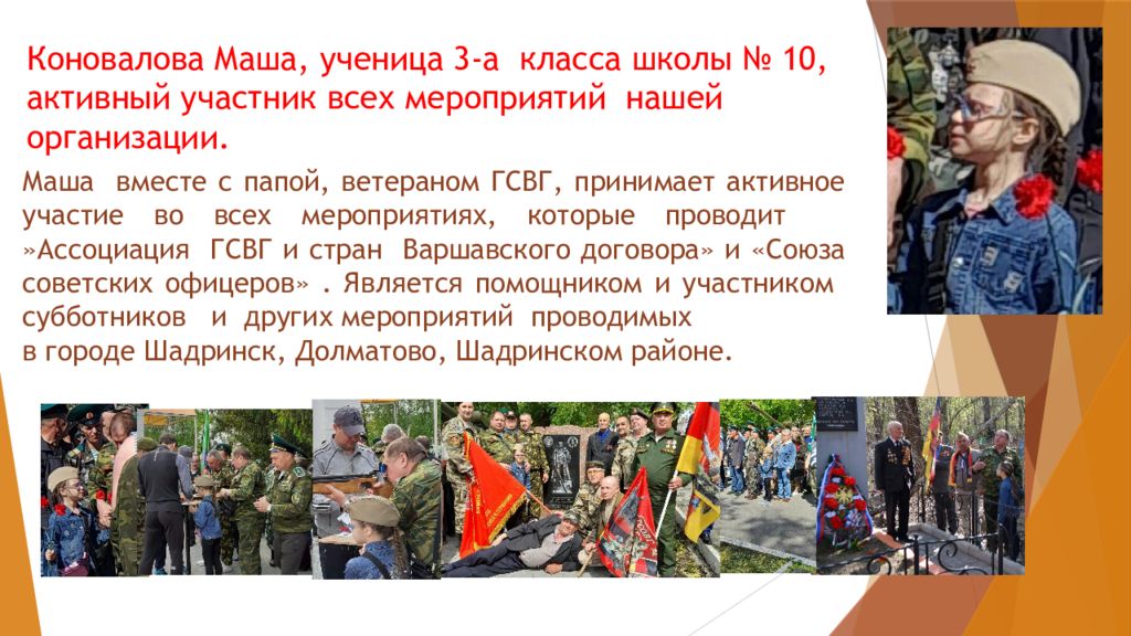 Маша вместе с папой, ветераном ГСВГ, принимает активное участие во всех мероприятиях, которые проводит »Ассоциация ГСВГ и стран Варшавского договора» и «Союза советских офицеров». Является помощником и участником субботников и других мероприятий проводимых в городе Шадринск, Долматово, Шадринском районе.