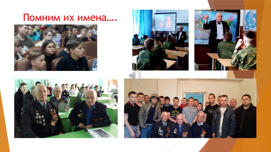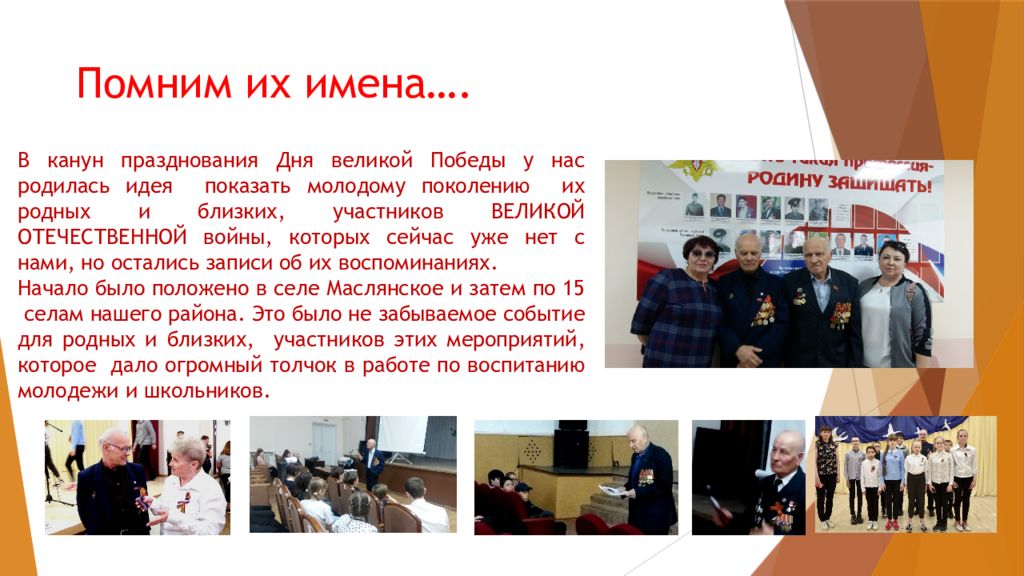 В канун празднования Дня великой Победы у нас родилась идея показать молодому поколению их родных и близких, участников ВЕЛИКОЙ ОТЕЧЕСТВЕННОЙ войны, которых сейчас уже нет с нами, но остались записи об их воспоминаниях. Начало было положено в селе Маслянское и затем по 15 селам нашего района. Это было не забываемое событие для родных и близких, участников этих мероприятий, которое дало огромный толчок в работе по воспитанию молодежи и школьников.