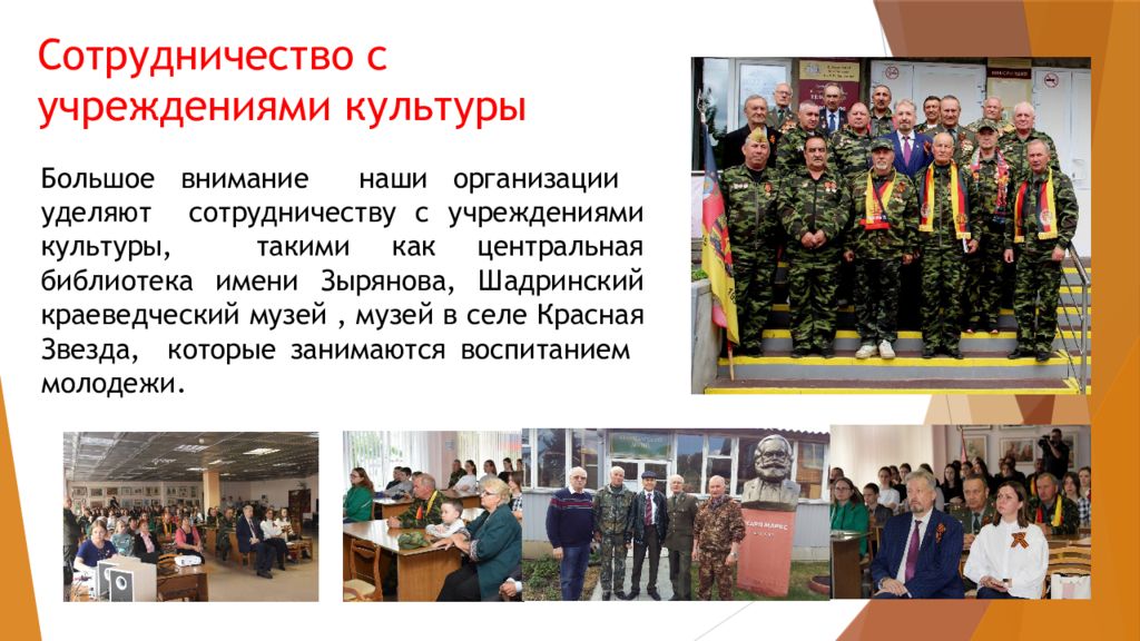 Большое внимание наши организации уделяют сотрудничеству с учреждениями культуры, такими как центральная библиотека имени Зырянова, Шадринский краеведческий музей, музей в селе Красная Звезда, которые занимаются воспитанием молодежи.