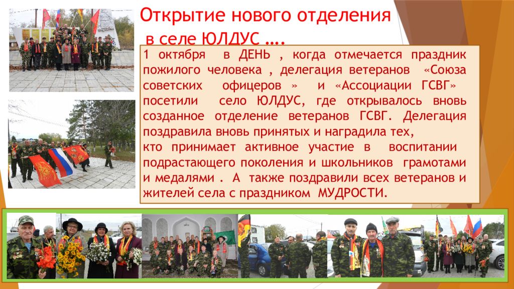 1 октября в ДЕНЬ, когда отмечается праздник пожилого человека, делегация ветеранов «Союза советских офицеров » и «Ассоциации ГСВГ» посетили село ЮЛДУС, где открывалось вновь созданное отделение ветеранов ГСВГ. Делегация поздравила вновь принятых и наградила тех, кто принимает активное участие в воспитании подрастающего поколения и школьников грамотами и медалями. А также поздравили всех ветеранов и жителей села с праздником МУДРОСТИ.
