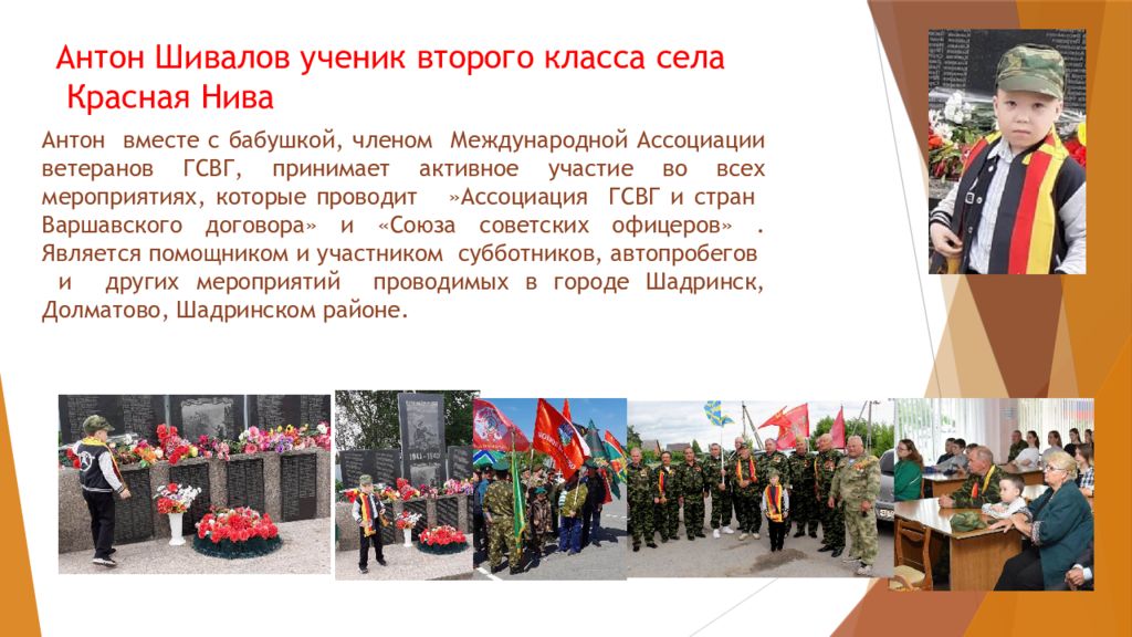 Антон вместе с бабушкой, членом Международной Ассоциации ветеранов ГСВГ, принимает активное участие во всех мероприятиях, которые проводит »Ассоциация ГСВГ и стран Варшавского договора» и «Союза советских офицеров». Является помощником и участником субботников, автопробегов и других мероприятий проводимых в городе Шадринск, Долматово, Шадринском районе.
