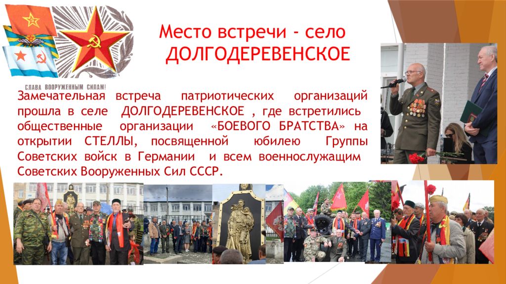 Замечательная встреча патриотических организаций прошла в селе ДОЛГОДЕРЕВЕНСКОЕ, где встретились общественные организации «БОЕВОГО БРАТСТВА» на открытии СТЕЛЛЫ, посвященной юбилею Группы Советских войск в Германии и всем военнослужащим Советских Вооруженных Сил СССР.