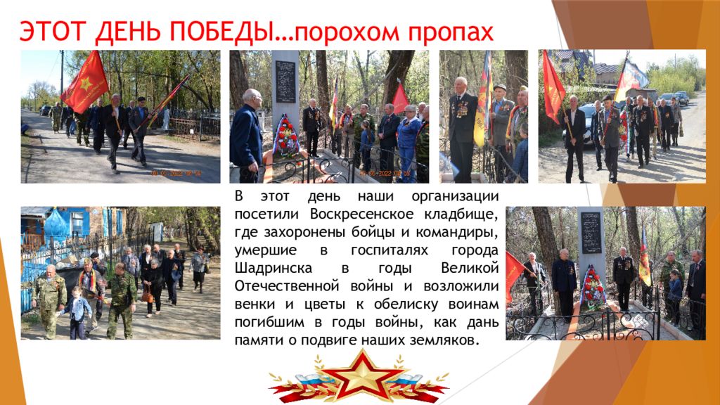 В этот день наши организации посетили Воскресенское кладбище, где захоронены бойцы и командиры, умершие в госпиталях города Шадринска в годы Великой Отечественной войны и возложили венки и цветы к обелиску воинам погибшим в годы войны, как дань памяти о подвиге наших земляков.