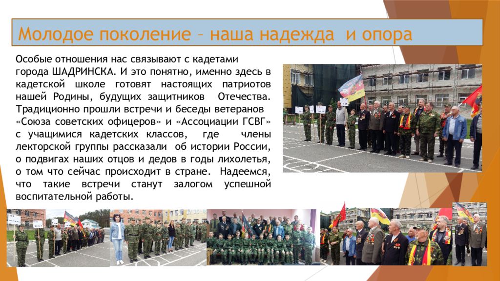Особые отношения нас связывают с кадетами г орода ШАДРИНСКА. И это понятно, именно здесь в кадетской школе готовят настоящих патриотов нашей Родины, будущих защитников Отечества. Традиционно прошли встречи и беседы ветеранов «Союза советских офицеров» и «Ассоциации ГСВГ» с учащимися кадетских классов, где члены лекторской группы рассказали об истории России, о подвигах наших отцов и дедов в годы лихолетья, о том что сейчас происходит в стране. Надеемся, что такие встречи станут залогом успешной воспитательной работы.