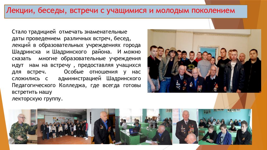 Стало традицией отмечать знаменательные д аты проведением различных встреч, бесед, л екций в образовательных учреждениях города Шадринска и Шадринского района. И можно сказать многие образовательные учреждения идут нам на встречу, предоставляя учащихся для встреч. Особые отношения у нас сложились с администрацией Шадринского Педагогического Колледжа, где всегда готовы встретить нашу л екторскую группу. Лекции, беседы, встречи с учащимися и молодым поколением