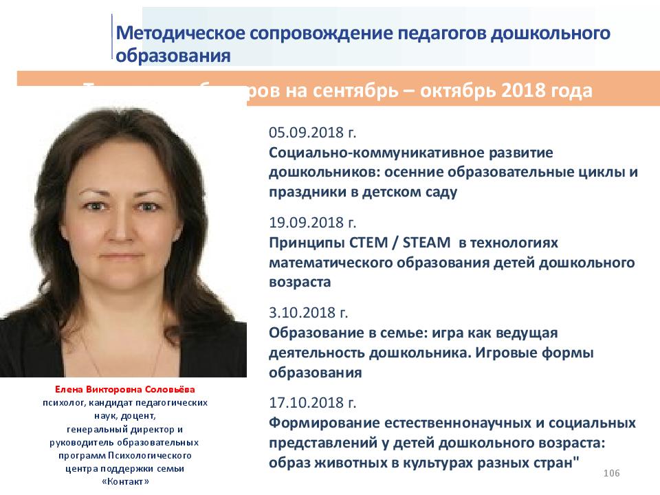 106 Методическое сопровождение педагогов дошкольного образования Тематика вебинаров на сентябрь – октябрь 2018 года 05.09.2018 г. Социально-коммуникативное развитие дошкольников: осенние образовательные циклы и праздники в детском саду 19.09.2018 г. Принципы СТЕМ / STEAM в технологиях математического образования детей дошкольного возраста 3.10.2018 г. Образование в семье: игра как ведущая деятельность дошкольника. Игровые формы образования 17.10.2018 г. Формирование естественнонаучных и социальных представлений у детей дошкольного возраста: образ животных в культурах разных стран" Елена Викторовна Соловьёва психолог, кандидат педагогических наук, доцент, генеральный директор и руководитель образовательных программ Психологического центра поддержки семьи «Контакт»