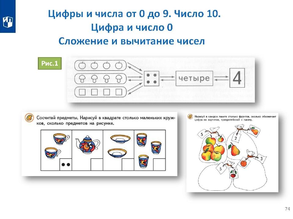 Слайд 74: Цифры и числа от 0 до 9. Число 10. Цифра и число 0 Сложение и вычитание чисел
